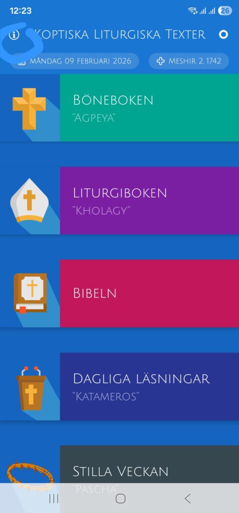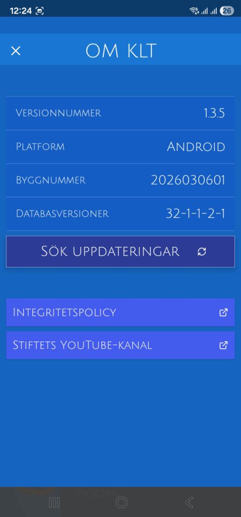Efter uppdateringen ska det stÄ samma byggnummer och databasversioner som i andra bifogad bilden. Ni kommer till Om-sidan genom att trycka pÄ i-ikonen högst upp i appen
